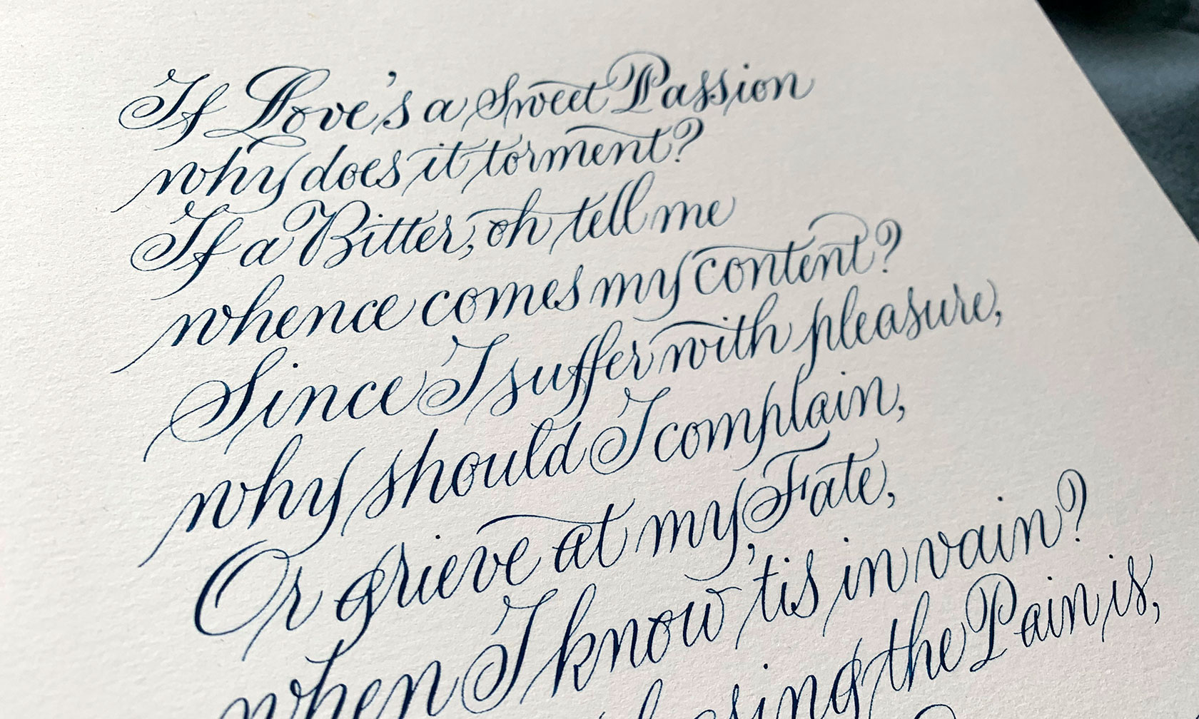 Liedtext von Henry Purcell kalligrafisch interpretiert mit Blau und Blassgold auf BĂĽttenpapier