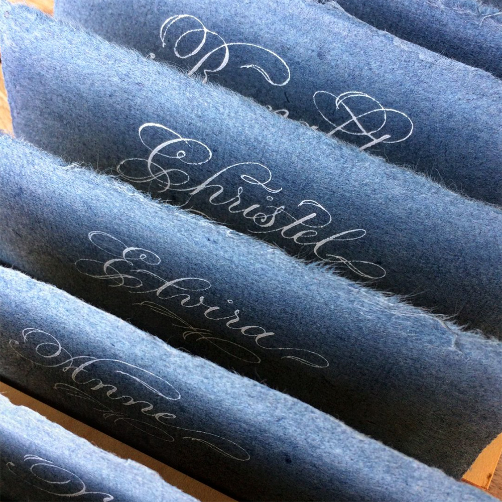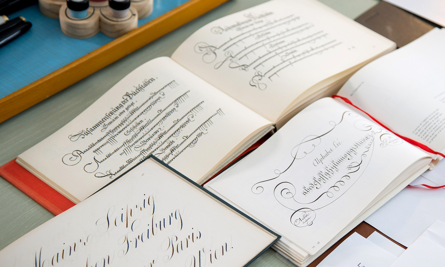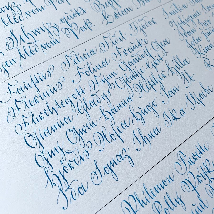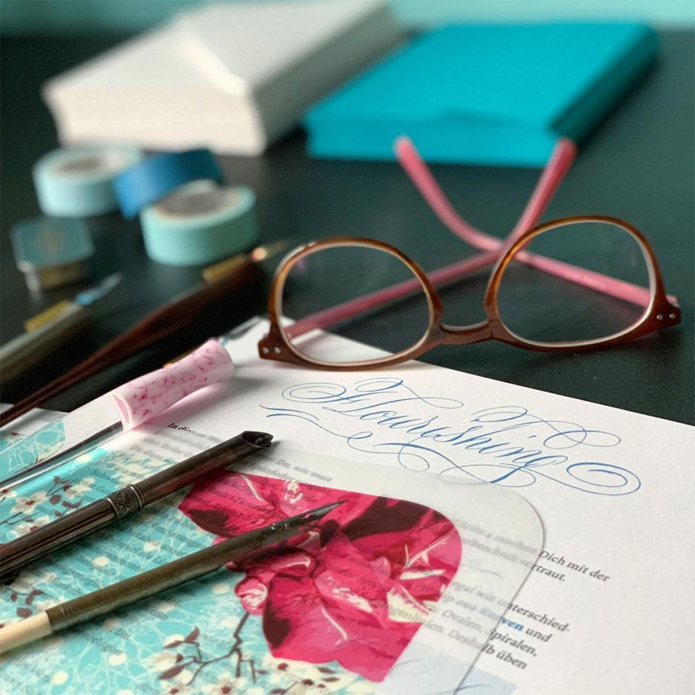 In meinen Workshops biete ich eine fundierte, intensive Grundlage für das Erlernen der Spitzfeder-Kalligrafie. Mein Fokus liegt vor allem darauf, Ihnen Methoden und Handwerkszeug zu vermitteln, um selbständig weiter zu üben. Meine Workshops richten sich generell an alle, die sich – ob hobbymäßig oder professionell – gern mit Handschrift beschäftigen. Gerade für absolute Anfänger*innen können Workshops die perfekte Methode sein, um die »Basics« kennenzulernen – manche Techniken mit Feder und Tinte bleiben selbst in guten Büchern etwas kryptisch, da habe ich schon so manchen »Aha«-Moment erlebt (übrigens auch selbst als Teilnehmerin bei Kursen anderer Kalligraf*innen)! Neben den Grundlagenkursen biete ich auch projektbezogene oder Kurse zu vertiefenden Themen an – zum Beispiel Verzierungen, Gestaltung mit Kalligrafie, Umgang mit schwierigen oder spezielleren Techniken und Materialien und so weiter. Ich kann auf Deutsch oder Englisch unterrichten – und auch Onlinekurse habe ich geplant!
