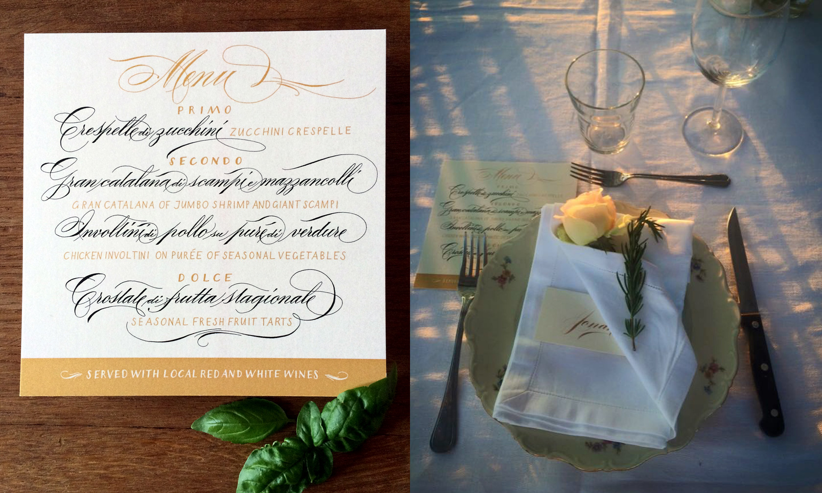 Für Michelles und Jonahs romantische Vintage-Hochzeit in der Toskana gestaltete ich die Menu- und Tischkarten sowie ein Schild für das Antipasti-Buffet. Stilistisch habe ich mich hier an der klassichen Einladung orientiert, die in Creme, Gold und Schwarz gehalten war.