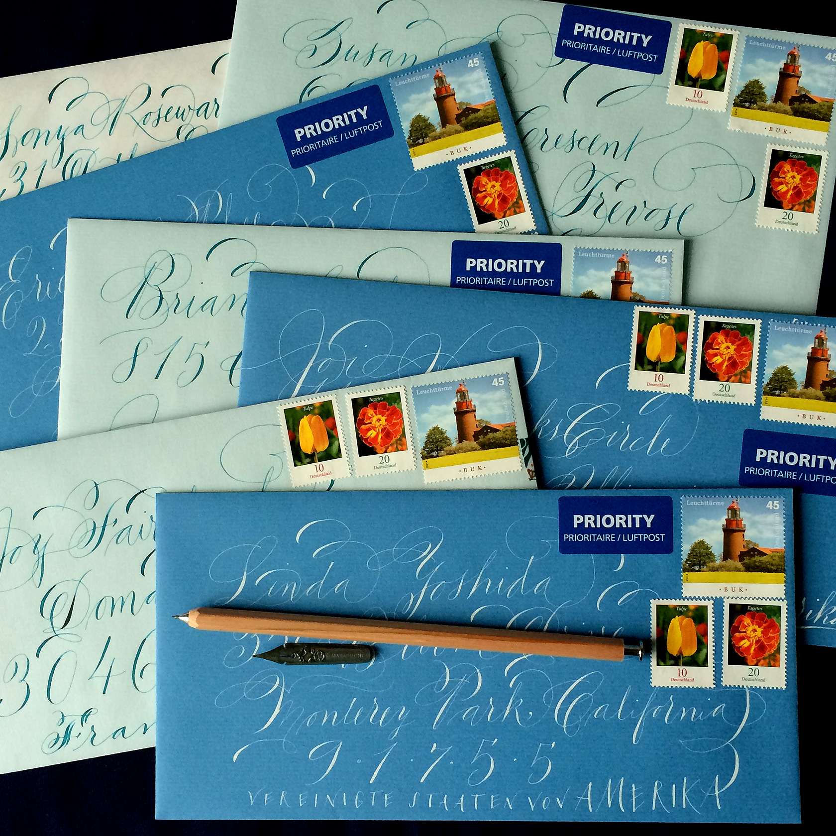 I offer three basic envelope styles without a design fee – in any script you wish, and many ink colors: