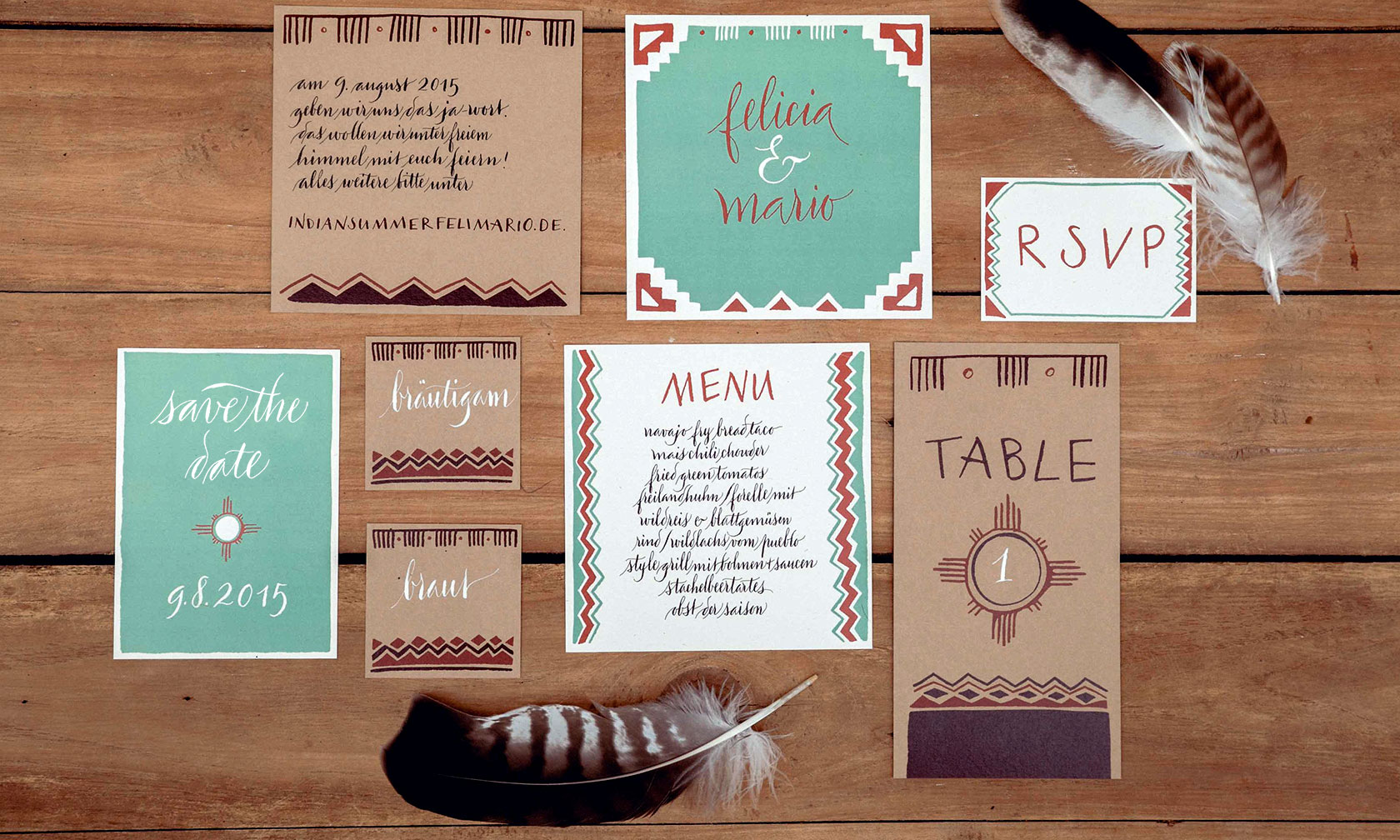 Wedding suite in Pueblo style with Save-the-Date card, invitation with RSVP card and envelope calligraphy, menu, place and table number cards. More pictures of that dreamy wedding inspiration can be found here! :: © for the photography Cantico Photography